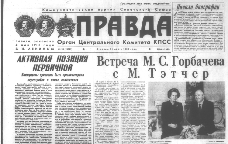 The 1987 Thatcher–Gorbachev meeting in Moscow on the front page of Pravda the next day.