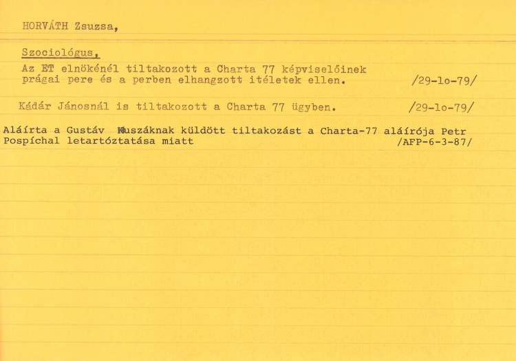 The regime had its impact on the career of Zsuzsa Horváth even beyond research tools and topics. Her scientific practice was being observed and obstructed already owing to its field of interest; furthermore, she participated in the activities of the democratic opposition from the very beginning. She and Csákó organized the typewriting of samizdat texts, she stored and distributed samizdat publications, during a house search in their apartment the police confiscated a truckload of material, and, most importantly, she signed the petitions objecting the retaliations against the Charter 77 organizers, which were sent to the Presidential Council of the People's Republic of Hungary, as well as personally to János Kádár. The signatories of these petitions became victims to the regime's revenge; Horváth lost her job at the Hungarian Academy of Sciences's Institute of Philosophy, and thus the institutional support and background of her research was gone at once; she and Csákó, her life partner, became recurring subjects in secret police reports under the cover names "Mr. Mediator" and "Mrs. Mediator."